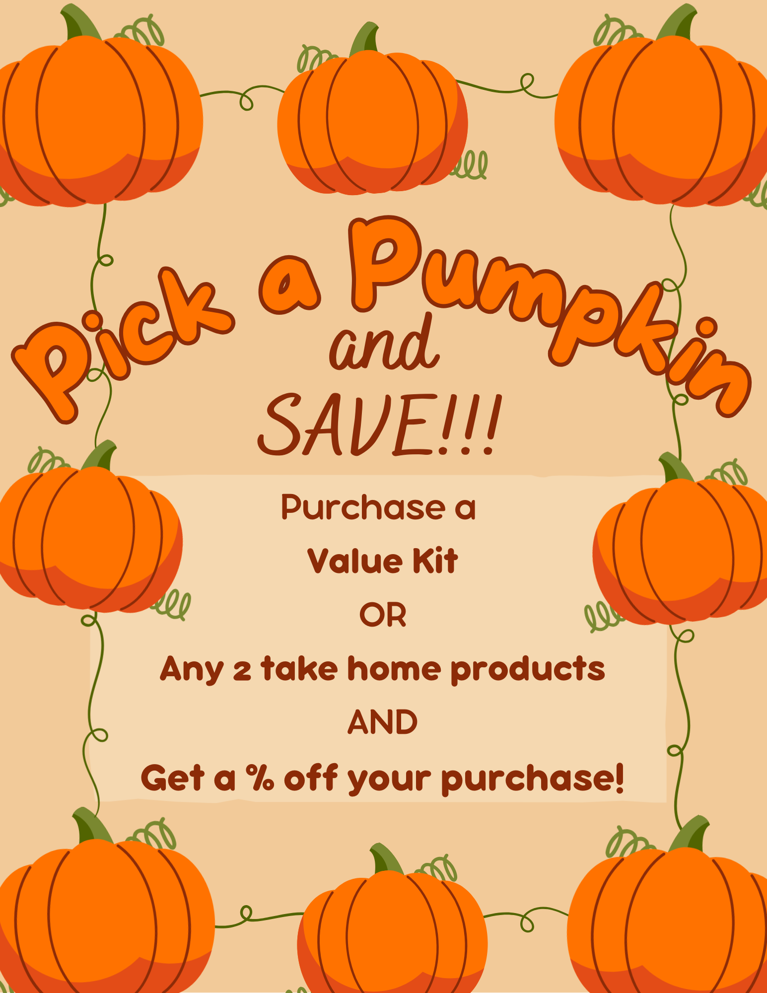 - Pick a pumpkin for a discount on a holiday box/value kit OR 2 retail items!